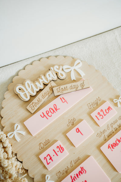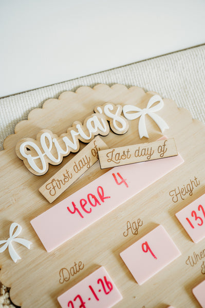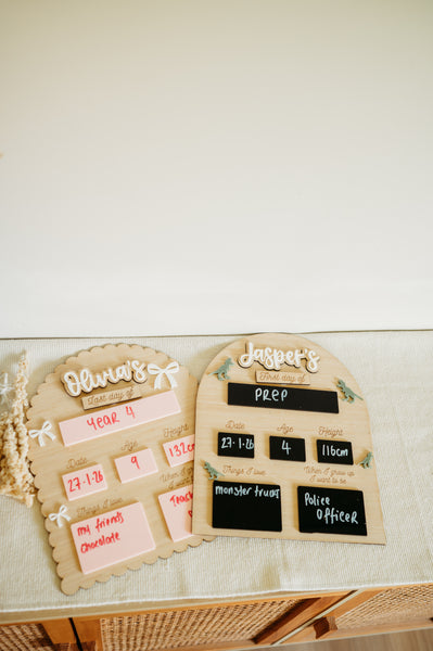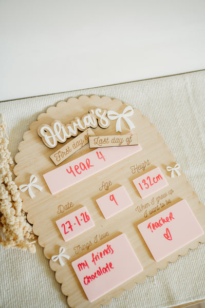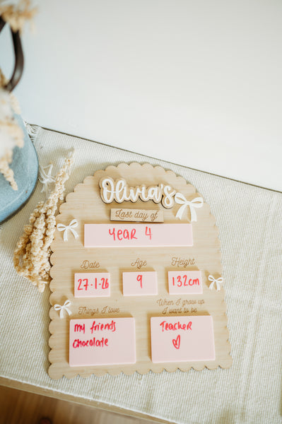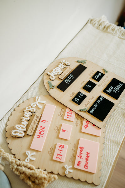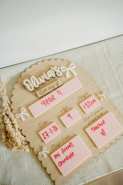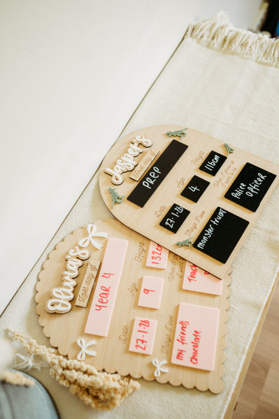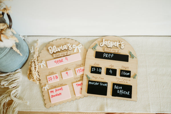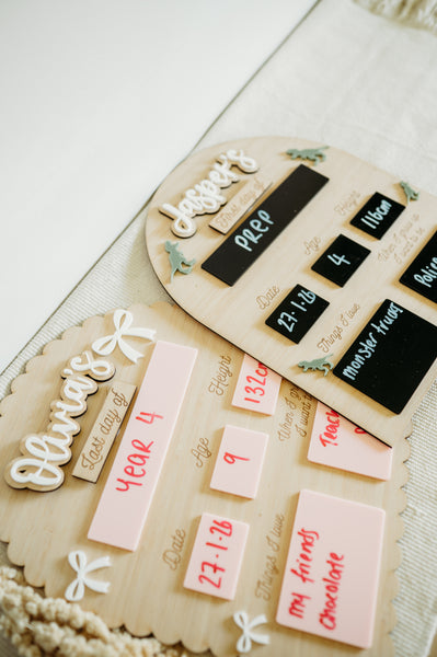 * Each board will come with "first day of" and "last day of" on velcro to change as well as each name.
